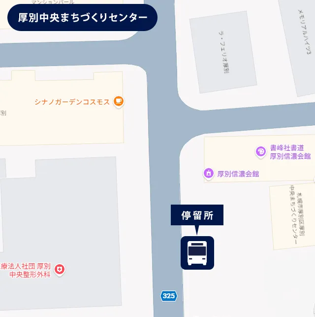 | 厚別中央まちづくりセンター | 13:02 | 13:32 | 14:02 | 14:32 | 15:32 | 16:02 | 16:32 | 17:02 |